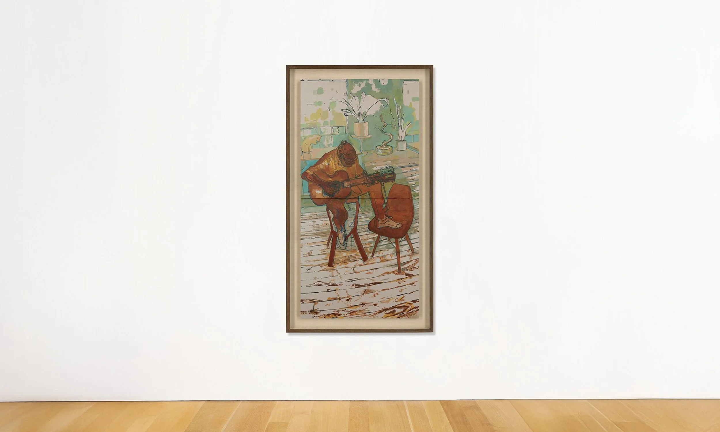 Moss’ process layered mark upon mark, drawing on each session’s unique variations. The result is a composition where figure and space coalesce, and presence and memory intertwine. The luminous, fragmentary interior — arranged with plants, furniture, and worn floorboards — becomes both stage and echo for this quiet performance. Through drawing and painting, Moss evokes rhythm, improvisation, and the fragile equilibrium of gesture, inviting viewers to consider how sound, space, and form thread in the fleeting moments of daily life.